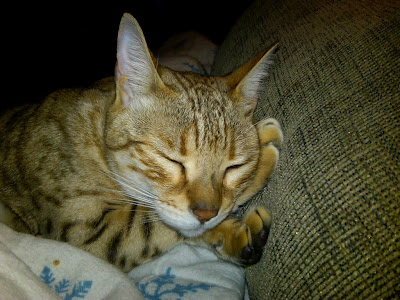 Alright off to workI’d better keep my trainee out of the cookie jar today. I leave you with this adorable picture of Bagheera sleeping on Willow last night. Awww…Bengals Cats.